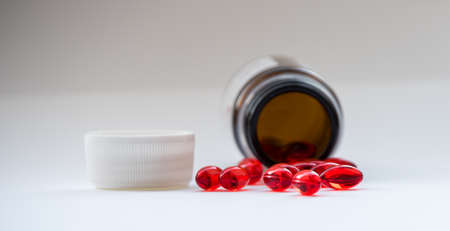 Jars of red pills. Tablets poured out of the jar on white background. Glass brown pill bottle