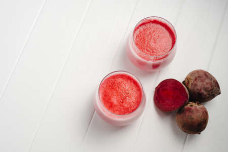 A glass of vibrant beet juice next to a fresh beetroot on a light table