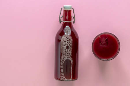 Sour cherry drink with ice in a glass and bottle. Top view, copy space for text. The concept of cold refreshing juice, morse, or kompot.