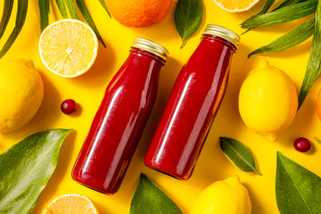 Bright red fruit juice bottles adorned by zesty lemons, juicy oranges, and lush green leaves set against a cheerful yellow backdrop, evoke freshness.