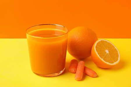 Glass of Fresh Carrot and Pumpkin Juice Healthy Diet Beverage Top View Blue background