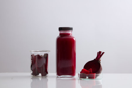 A glass bottle without label filled with beetroot juice. Beaker and petri dish of beetroot slices displayed. Beetroot (Beta vulgaris) may improve muscle power in people with heart failure