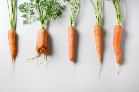 Comparison of freshly home-grown carrots, regular and unusual ugly shape.