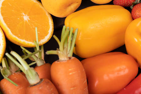 Full frame close up of various fresh organic healthy fruits and vegetables, copy space. unaltered, food, organic and healthy eating concept.