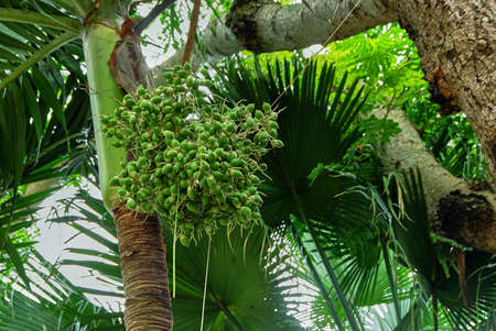 Palm tree leaves seeds fruits of a tropical green exotic and Caribbean Maya Chit palm palms in rainforest jungle Playa del Carmen Quintana Roo Mexico.