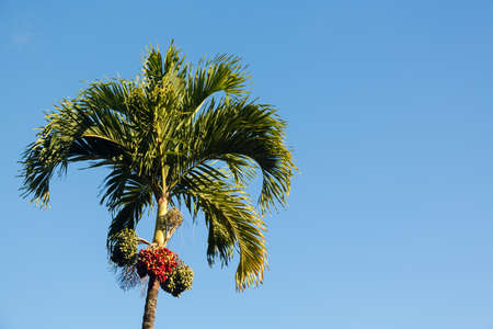 Betel nut palm tree with red fruits and blue sky in natural tropical Khon Kaen District Khon Kaen Province Isan Northeast Thailand in Southeast Asia.