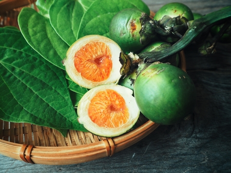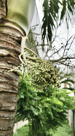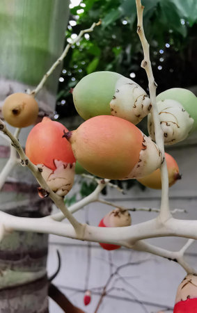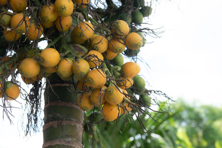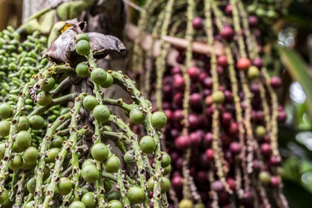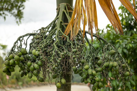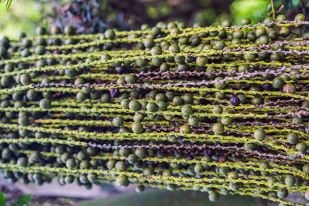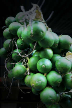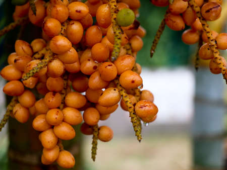 Close-up bunch of green and ripe tropical Betel Nut or Areca palm Catechu hanging on tree in Singapore. Commonly referred to as betel nut, often chewed wrapped in betel leaves