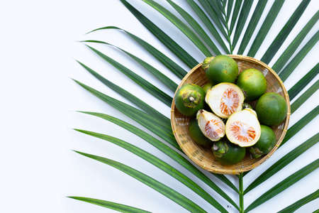 Areca catechu L. Betel nut palm tree with raw fruits isolated on white background.
