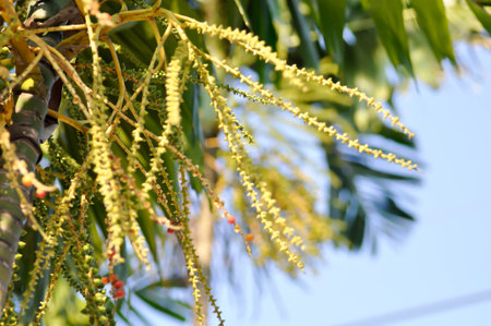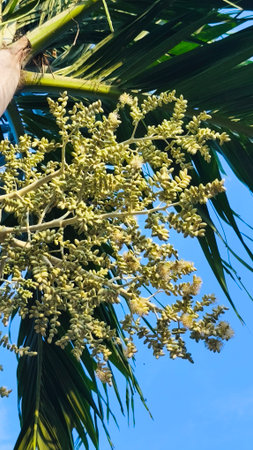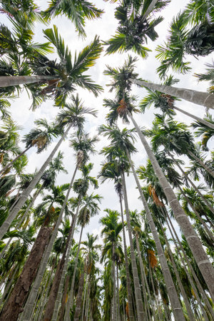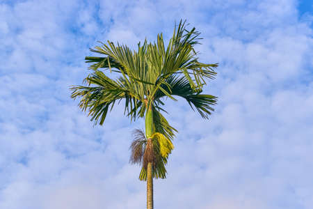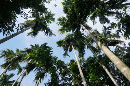 Areca palm or Areca nut tree is known as areca nut palm, betel palm, betel nut palm against the blue sky.