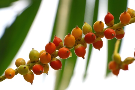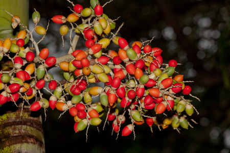 A group of Christmas palm tree fruit in various stages of ripeness.