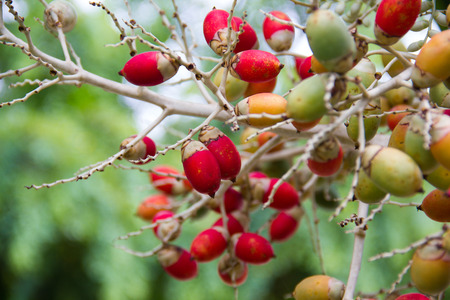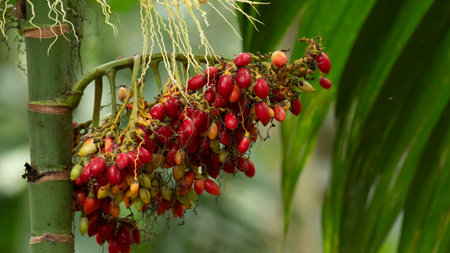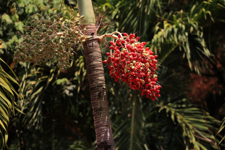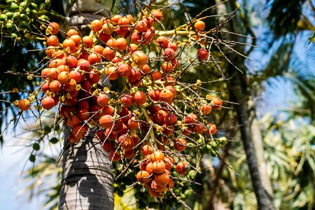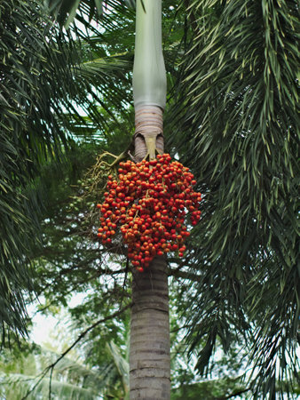 fresh betel palm bunch red fruits of decorative plant, red betel palm on the palm tree under natural sunlight and environment.