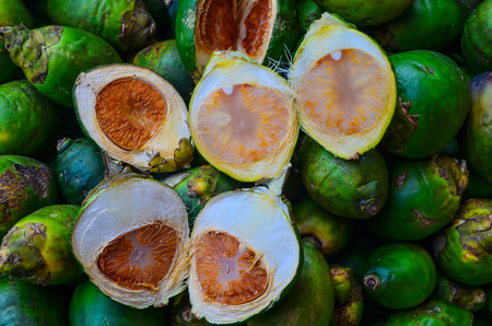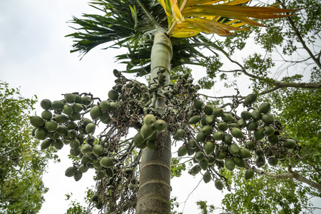 Areca nut, Areca nut palm or Areca palm or Betel nut palm or Betel Nuts or Areca catechu L or ARECACEAE or PALMAE or PALMACEAE or Areca nut seed on the tree