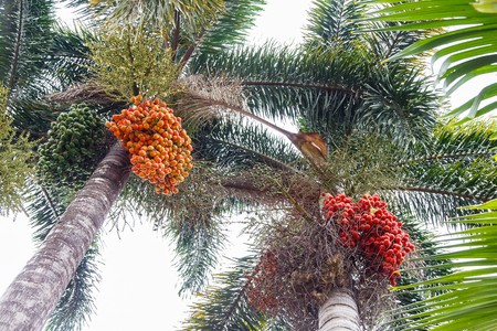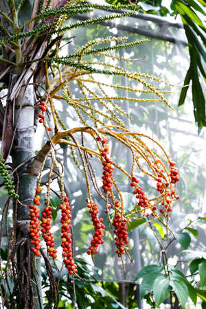 Betel nut palm tree with red fruits on natural tropical Koh Samui island in Surat Thani Thailand.