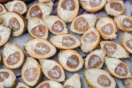 Heap of processed areca nuts cut in half revealing deep orange brown radial internal structure and dry exterior