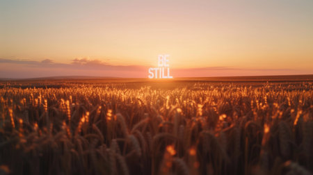 Neon Text Art In Dreamy Landscapes. Sunset over a wheat field with the inscription BE STILL in the background.
