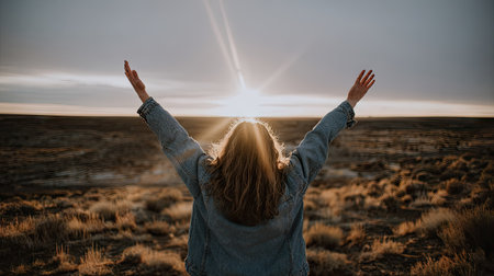 Young woman with arms outstretched enjoying the sunset in the desert.