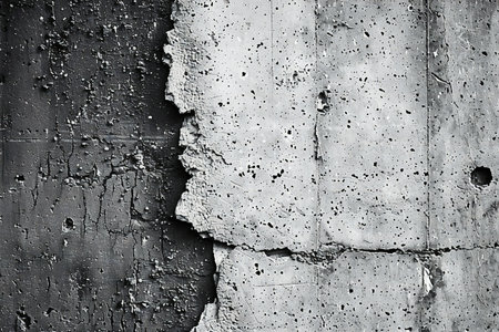 A black and white depiction of a solid concrete wall with various textures and patterns, creating a stark and industrial atmosphere.