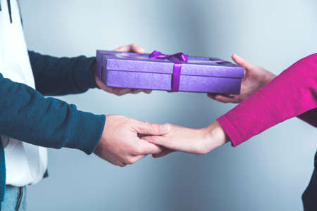 Top view of giving a present to a lovely person on colorful background. Couple congratulate each other. Festive concept. Copy space.