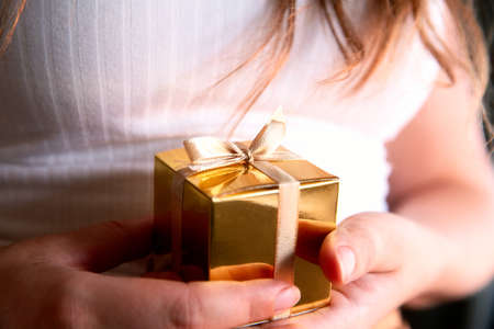 Womens hands holding gold gift box, Holiday present,birthday,Christmas, Father or Mothers, Valentines day close-up