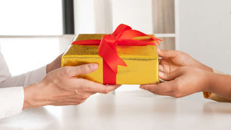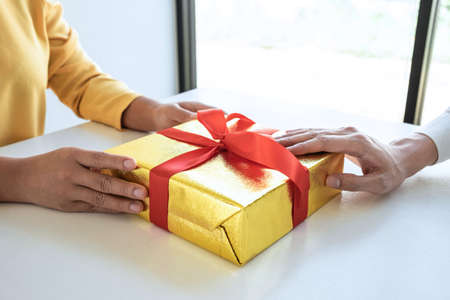 Couple giving gift box to each other with birthday greeting or celebration day and christmas.