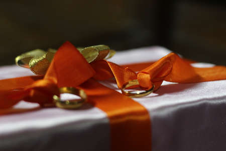 Groom and witness are finalizing preparation of golden rings before start of wedding ceremony.