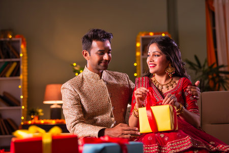 Romantic indian lovers exchanging gifts for Valentines Day or anniversary, trying to kiss each other, side view