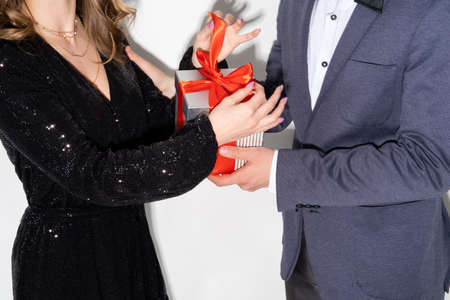 Holiday present. Happy anniversary. Romantic congratulation. Unrecognizable party couple glamour birthday woman opening gift box red ribbon bow from caring boyfriend isolated on white.