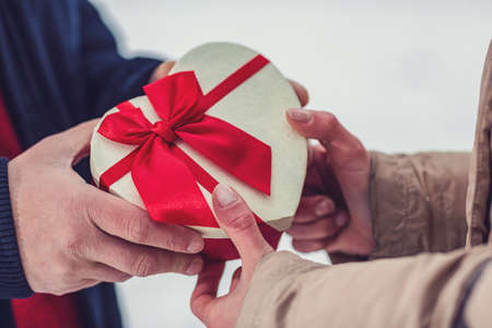 Beautiful Gift hearts - Man gives a box with a gift to his loving girlfriend,