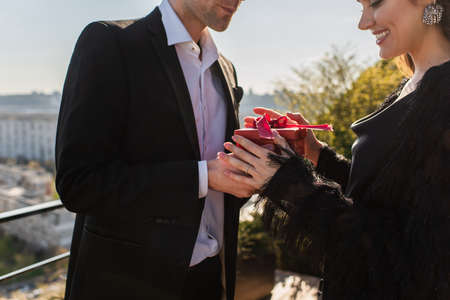 Close up of young man giving his girlfriend red gift box with pink ribbon. Woman receiving unexpected present. Celebrating concept. High quality photo