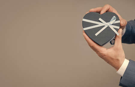 hands holding corporate giftbox on grey background with copy space. love date shopping sale