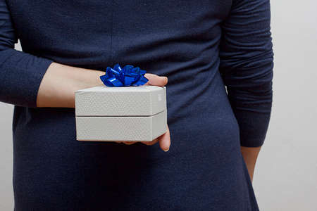 Close up of smiling woman is giving blue gift box for her happy beloved