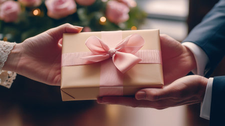Hands Exchanging a Gift Box with Pink Ribbon Tying for Valentine's Day Celebration Concept of Giving Love Romance and Special Occasions.