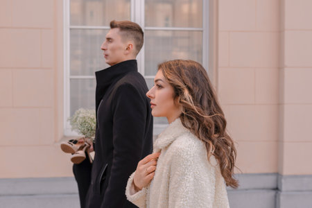 Beautiful couple in white. Future Groom and bride. bouquet of flowers
