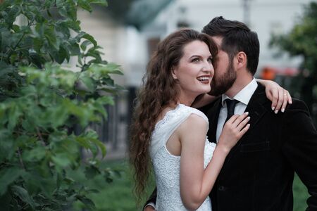 Happy bride and groom on their wedding day. Bride and groom in a park