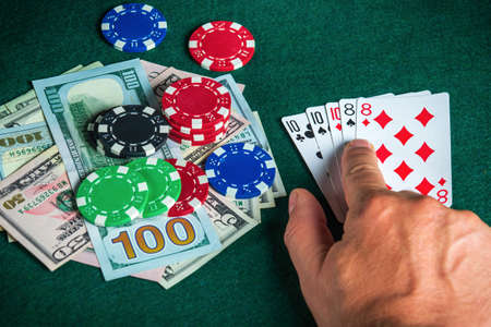 online poker games. red royal flush with dice and phone in casino. playing cards with blue deck on the green table. combination of cards on a green casino desk background with copy space. top view