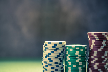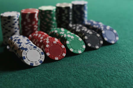 Pile of Casino pocker gambling chips on green table
