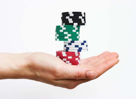 Isolated hand holding casino/poker chips - gambling concept perhaps???