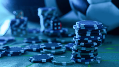 Close-up of red and blue casino chips stacked on a table with colorful neon lights in the background. The image conveys the vibrant atmosphere of a casino night.