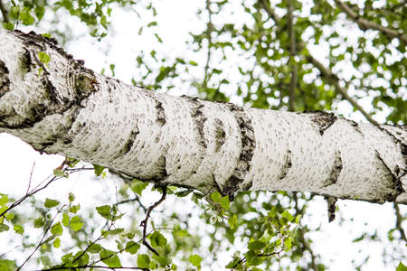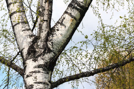 Silver birch tree trunk detail against white cloud background on blue sky. Betula pendula. Close-up of beautiful bright bark with long horizontal lenticels and spring green leaves on natural branches.
