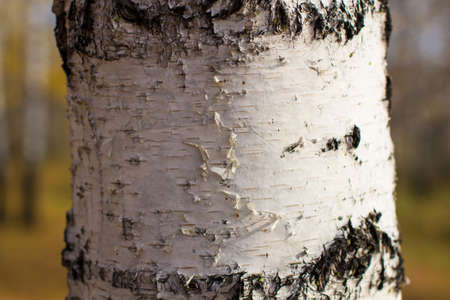natural background - white birch tree trunk close up and blurred yellow leaves on background in city park on overcast autumn day (focus on left birch tree trunk on foreground)