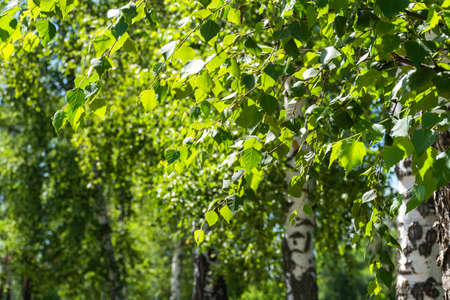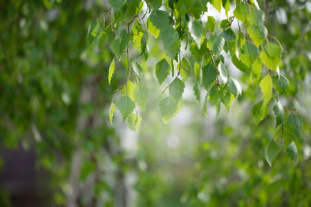 Birch leaves in the sunlight. Beautiful green natural background. Russian birch. Blurred forest background.