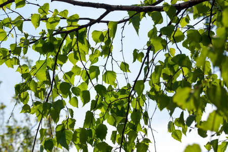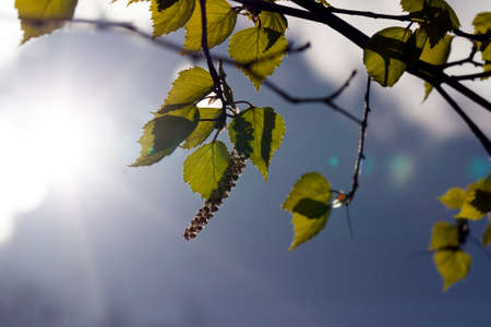 green leaves and earrings of a birch tree in early spring, against the backdrop of a sunny sky