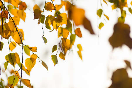 Autumn birch tree leaves background closeup. Creative photo. Autumn sunny beautiful day