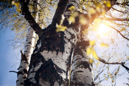 The trunk of a birch tree. Fresh spring leaves on the branches of a birch tree in the rays of the setting sun. Background with green birch branches. The appearing leaves on birch branches.