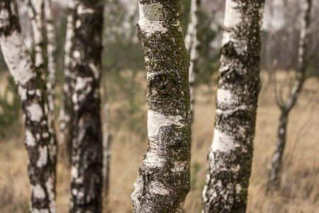 Close-up of a couple of birch trees in a forest. The trunks are covered with beautiful weathered bark
