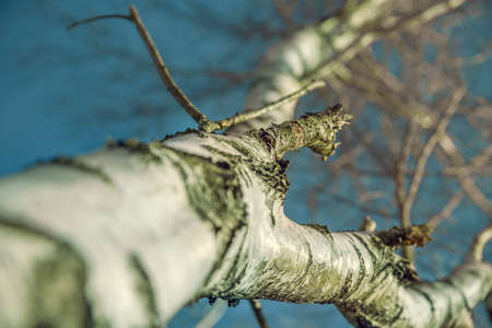 Birch tree trunk with branches in blue sky natural background