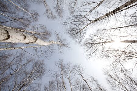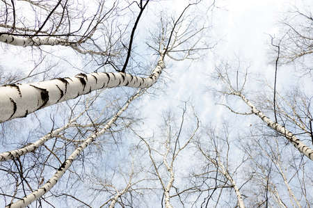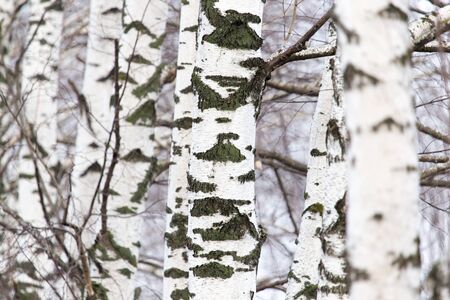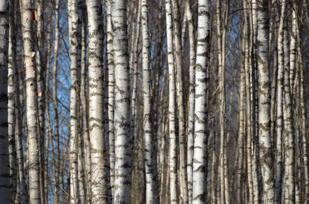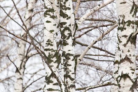 Spring forest with white birch trees. Russia, March.