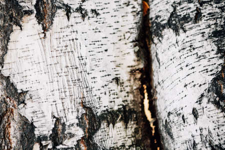 Bark of a birch tree backdrop close up, background from natural material, white crust with black stripes. Autumn forest.