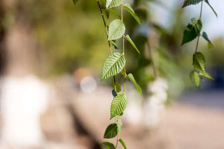 Birch tree with spring foliage on blurred green trees background, light bokeh outdoors in garden. Fresh nature background as wallpapers. soft focus. horizontal orientation.