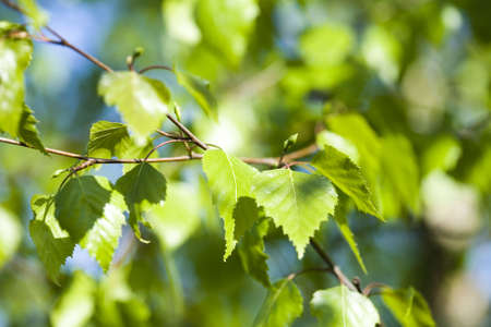 Foliage of a birch in the spring. Against a blue sky, photographed close-up
